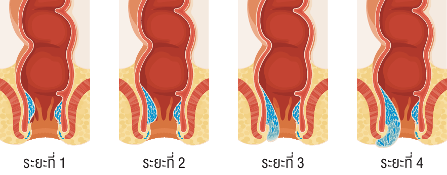 - ระยะที่ 4 หัวริดสีดวงทวารยื่นออกมาตลอดเวลา ไม่สามารถดันกลับเข้าที่ได้